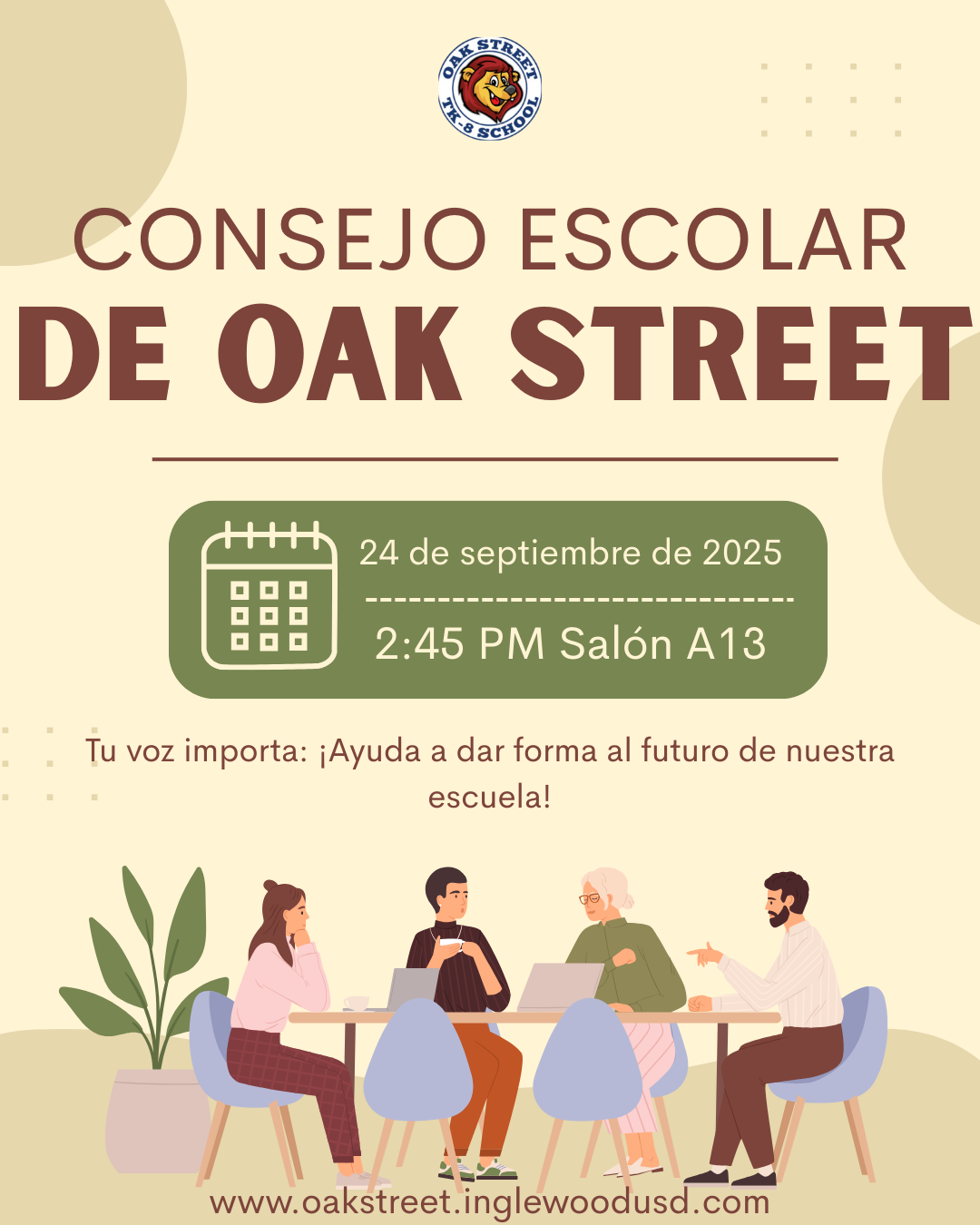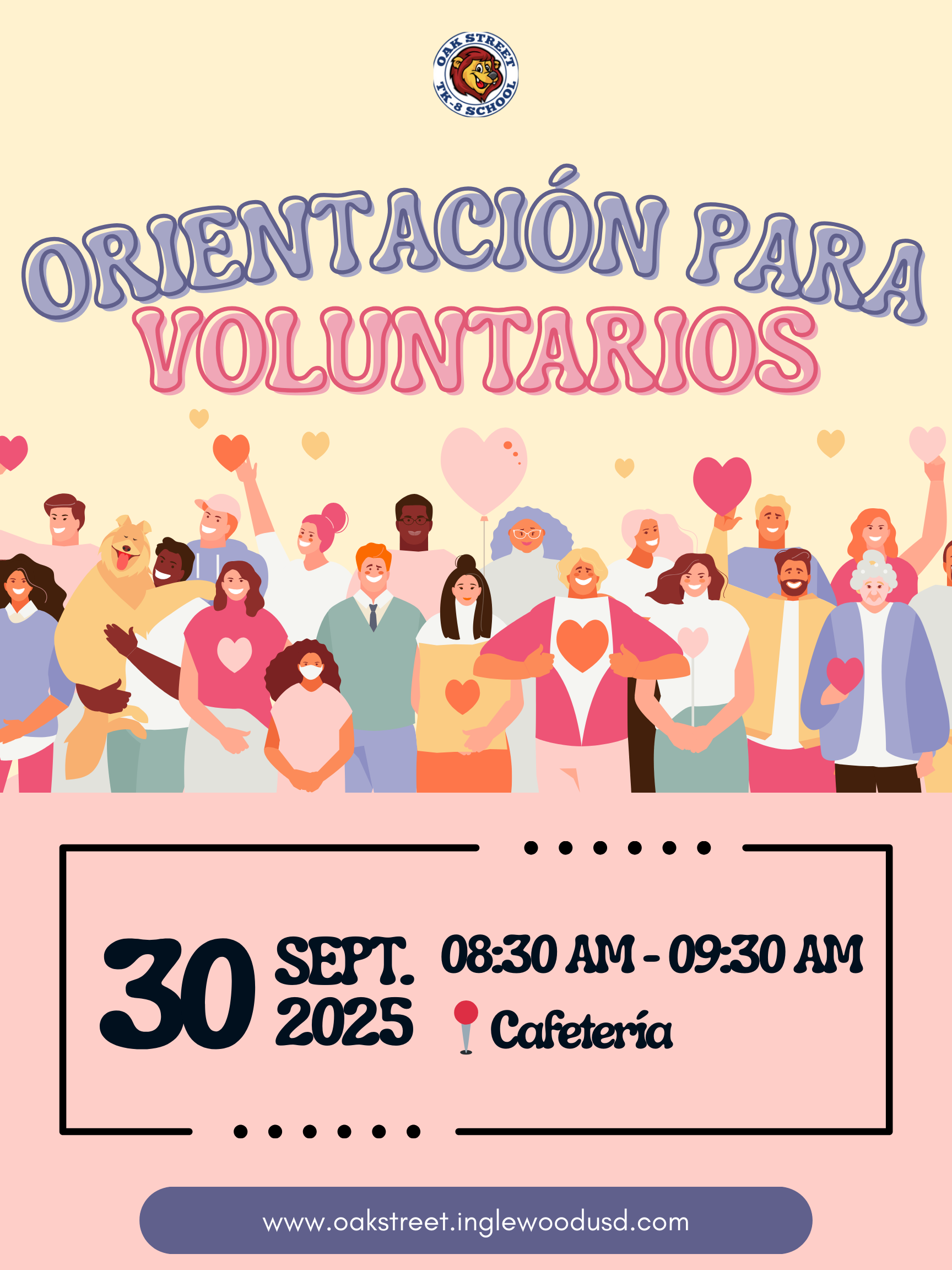Oak Street families, we’re excited to welcome you to our Volunteer Orientation on Tuesday, September 30, 2025, from 8:30–9:30 AM in the Cafeteria.